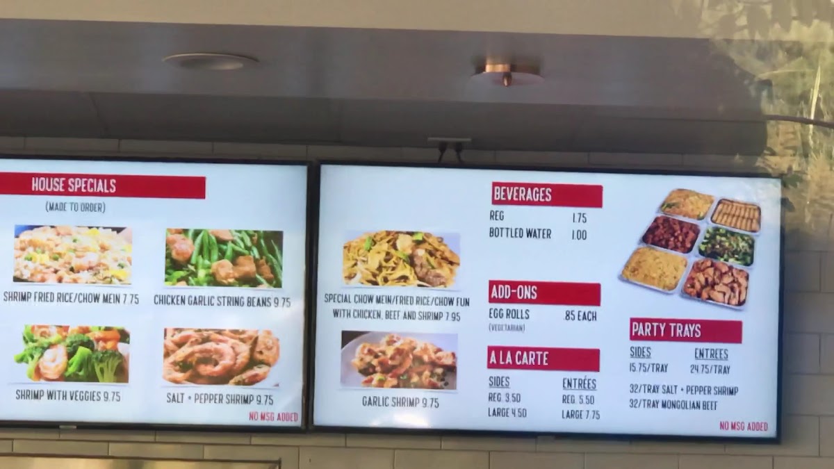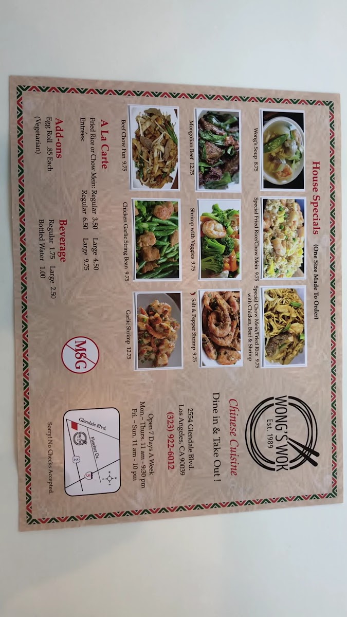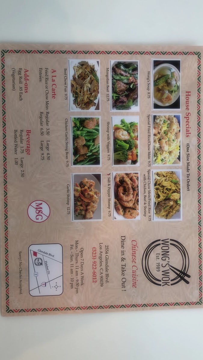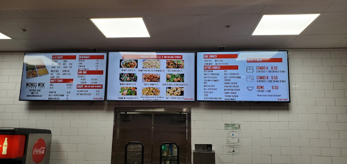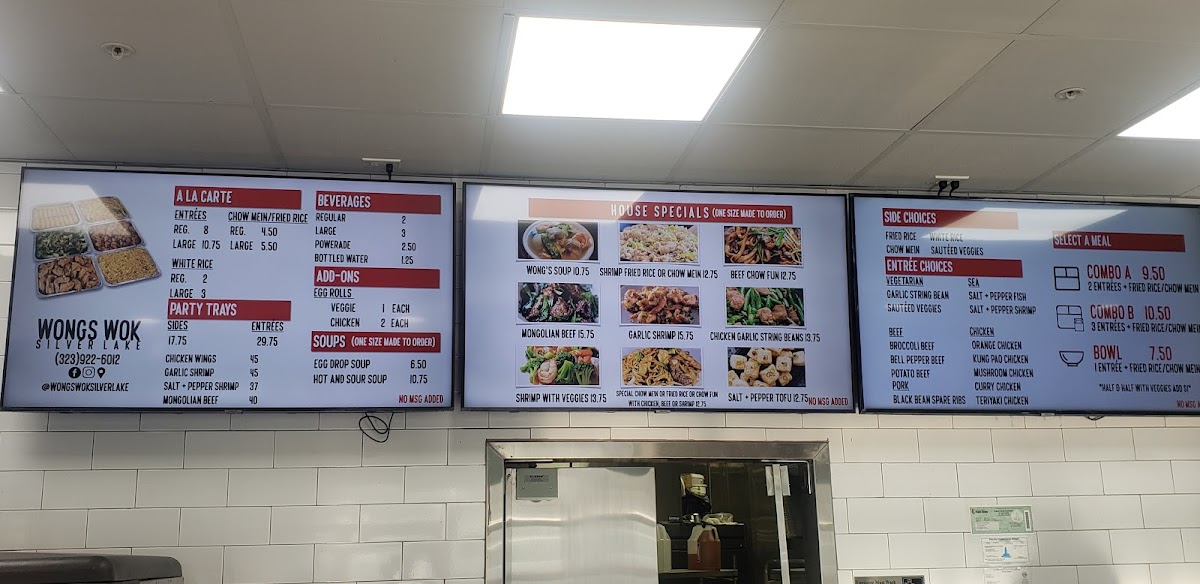 Wong's Wok Silver Lake offers a menu that balances classic Chinese favorites with a few signature twists. From the a la carte selections, diners can enjoy Chow Fun, Chow Mein, and a choice of White Rice or Fried Rice, complemented by add-ons like Veggie Egg Roll and Chicken Egg Roll. The house specials stand out, particularly Wongs Soup, Chicken Garlic String Beans, Broccoli Chicken, Mongolian Beef, and the comforting House Special Noodle Soup, each crafted to highlight bold flavors and fresh ingredients. For those sharing with family or friends, the Family Party Trays-featuring Chow Fun, Fried Rice, Chow Mein Entrees, and House Special Fried Rice-offer generous portions that cater to larger gatherings. The meal combos, including Combo Meal A, Combo Meal B, and Bowl, provide a convenient way to sample multiple favorites in one order, while the soup options like Hot and Sour Soup and Egg Drop Soup round out the menu with warming starters. Paired with beverages such as Soft Drink or Bottled Water, Wong's Wok manages to deliver a satisfying, approachable menu that’s ideal for both casual dining and sharing hearty meals with loved ones.